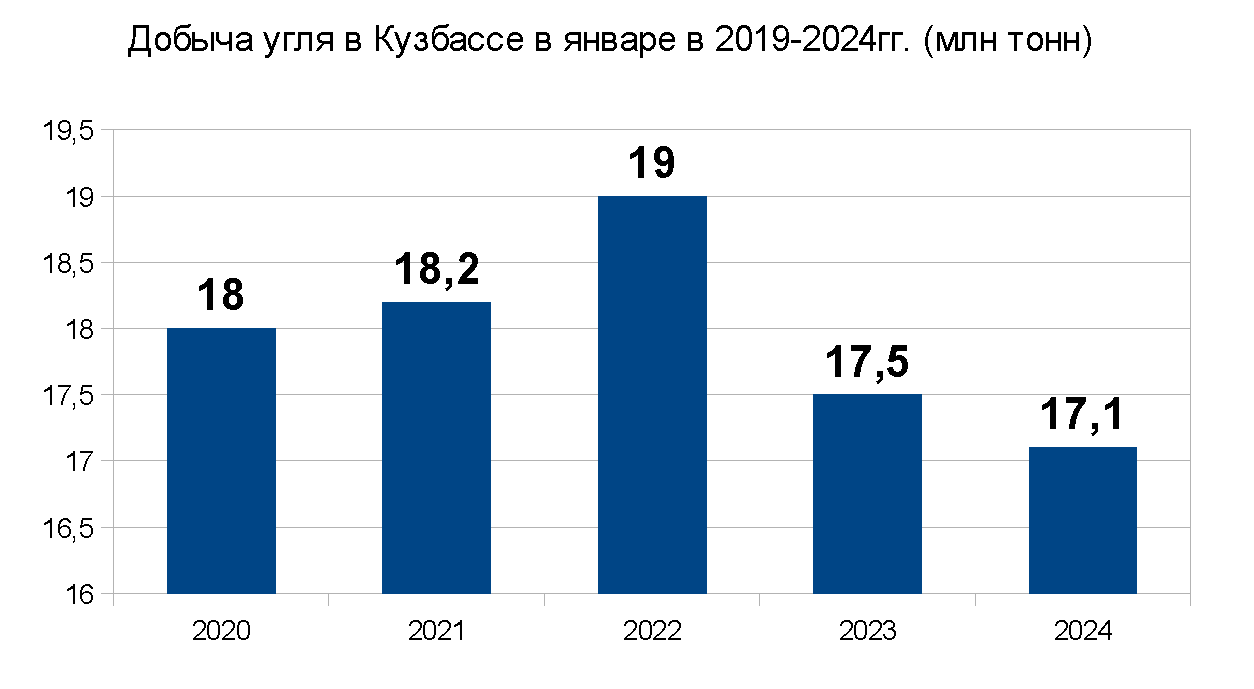 В январе 2024 года добыча угля в Кузбассе составила 17,1 млн тонн, что на 2,3% ниже уровня января прошлого года, 17,5 млн тонн.