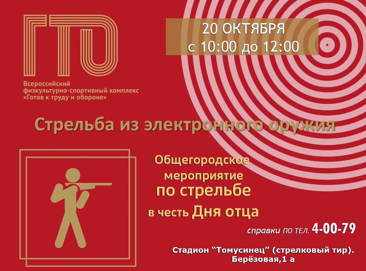 20 октября 2024 года с 10.00 до 12.00 часов в стрелковом тире «Томусинец» (Березовая, 1а) центр тестирования ГТО проводит стрельбы, посвященные Всероссийскому Дню ОТЦА. Это мероприятие направлено на укрепление семейных связей и популяризацию активного образа жизни среди родителей и детей.