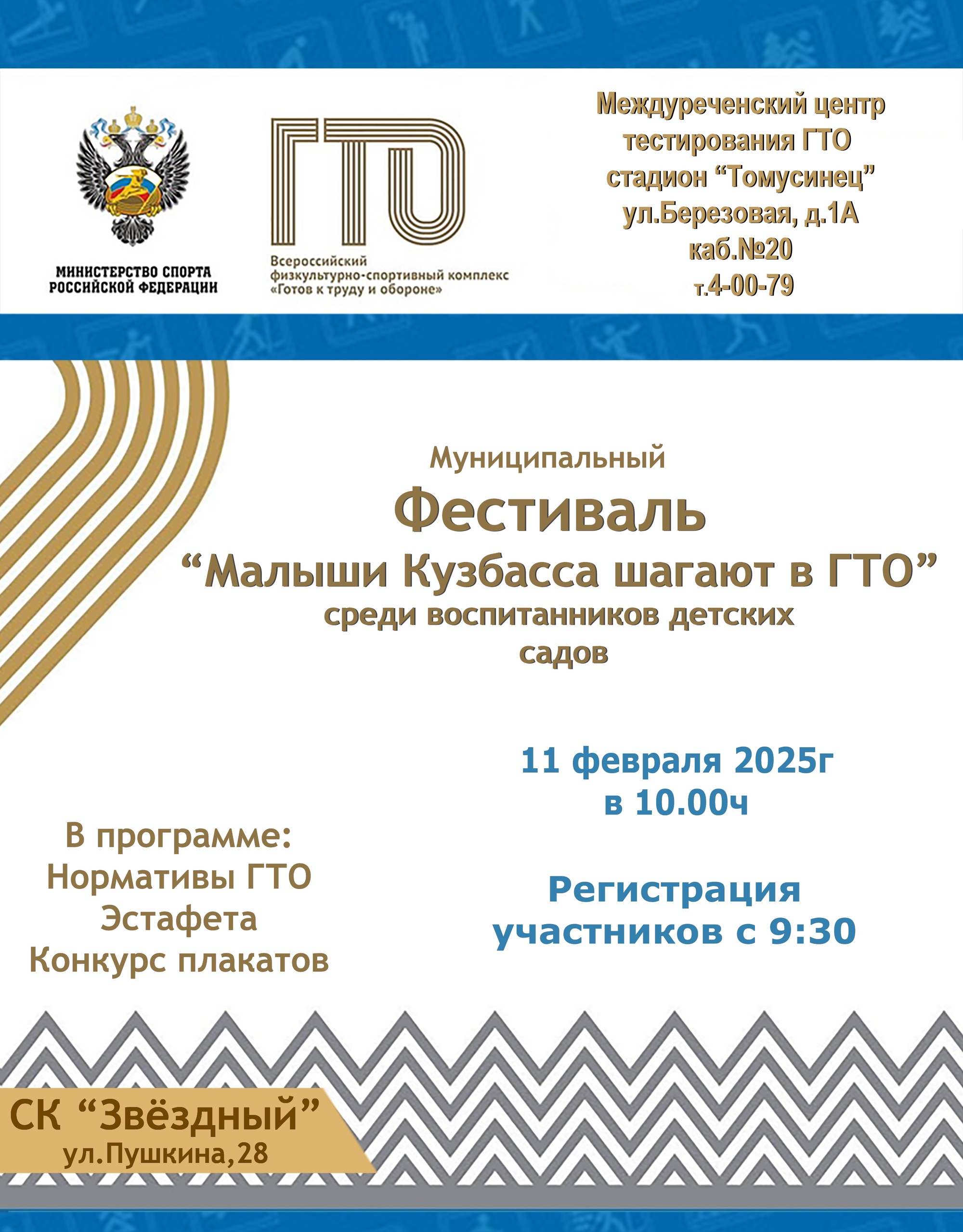 11 февраля 2025 года в 10.00 в спортивном зале СК «Звёздный» состоится муниципальный фестиваль ВФСК ГТО «Малыши Кузбасса шагают в ГТО!» среди воспитанников междуреченских детских садов и их родителей.