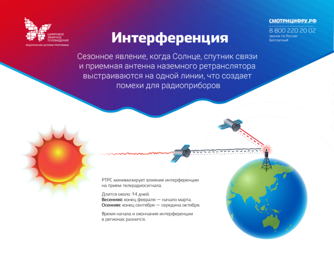 Телевизионный сигнал распространяется по стране через спутники связи, расположенные на геостационарных орбитах. Весной, когда Солнце смещается из Южного полушария в Северное, на несколько минут в сутки оно оказывается ровно позади спутника — на одной линии с приемной земной станцией. Сигналы спутника связи глушатся более мощным электромагнитным излучением светила. Затем благодаря вращению Земли вокруг своей оси космический аппарат уходит из-под «солнечной засветки».