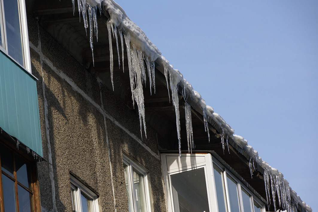 Хотя ночные температуры по-зимнему придерживаются минусовых отметок, днем снег постепенно подтаивает. И на карнизах крыш вырастают ледяные «сталактиты», которые рискуют сорваться вниз в любой момент.